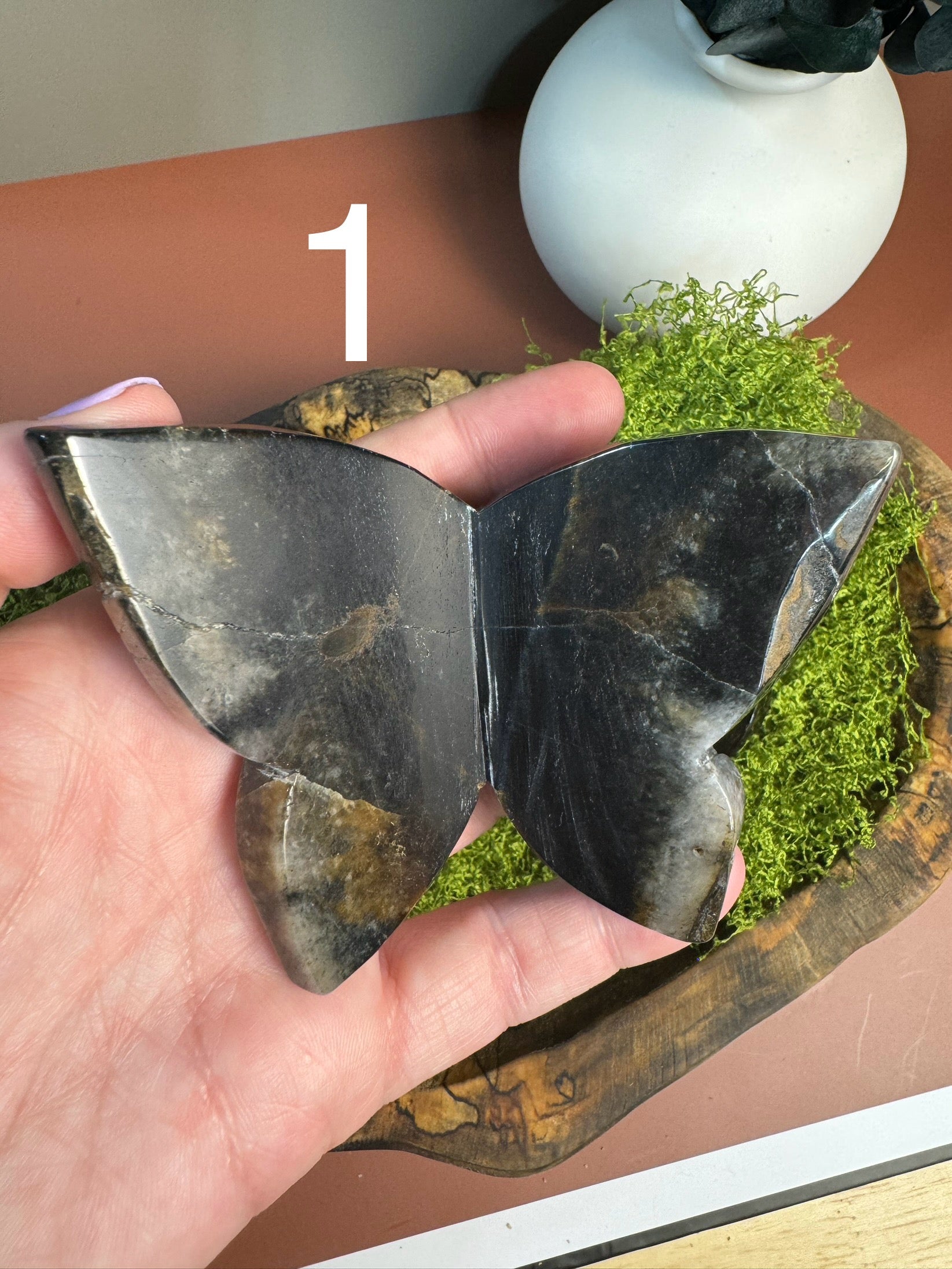 We had these butterflies hand-carved. They are natural Blue & Yellow Tiger's Eye. You choose by finding the number in the images that corresponds with the one you want.