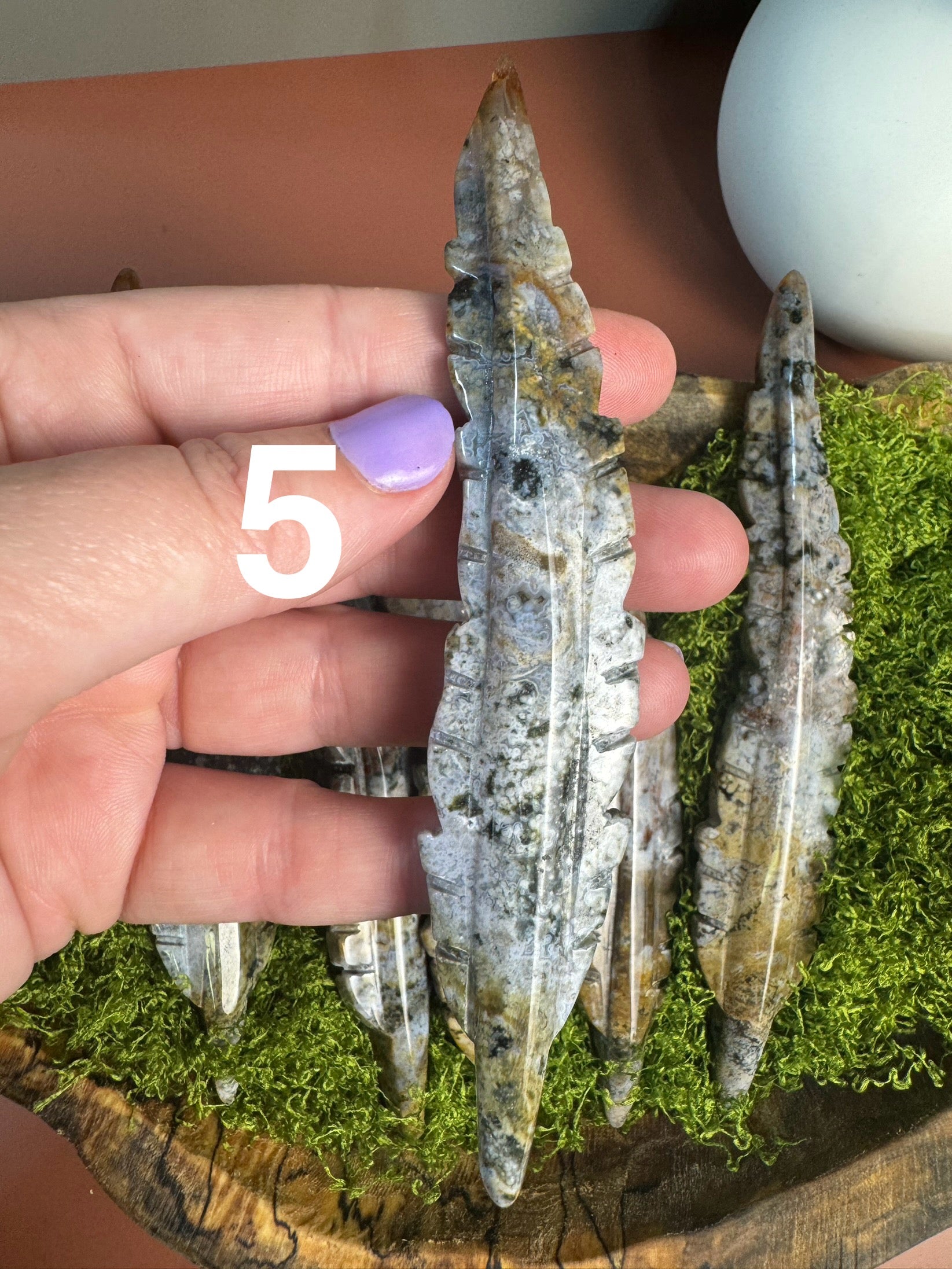 This listing is for high quality Orbicular Jasper Feathers. You choose which one you want by looking at the image and adding the corresponding number to the one you want to your cart.