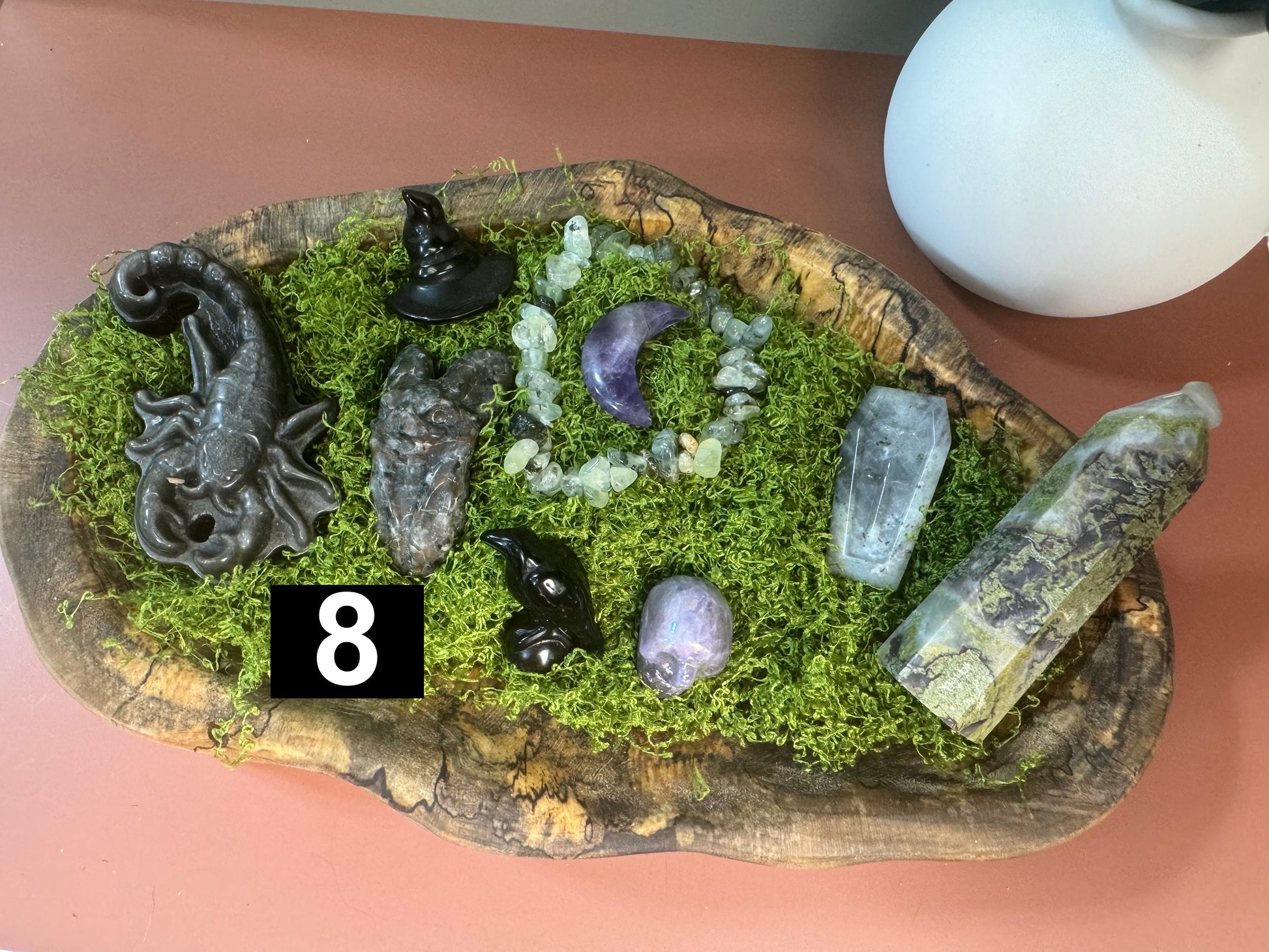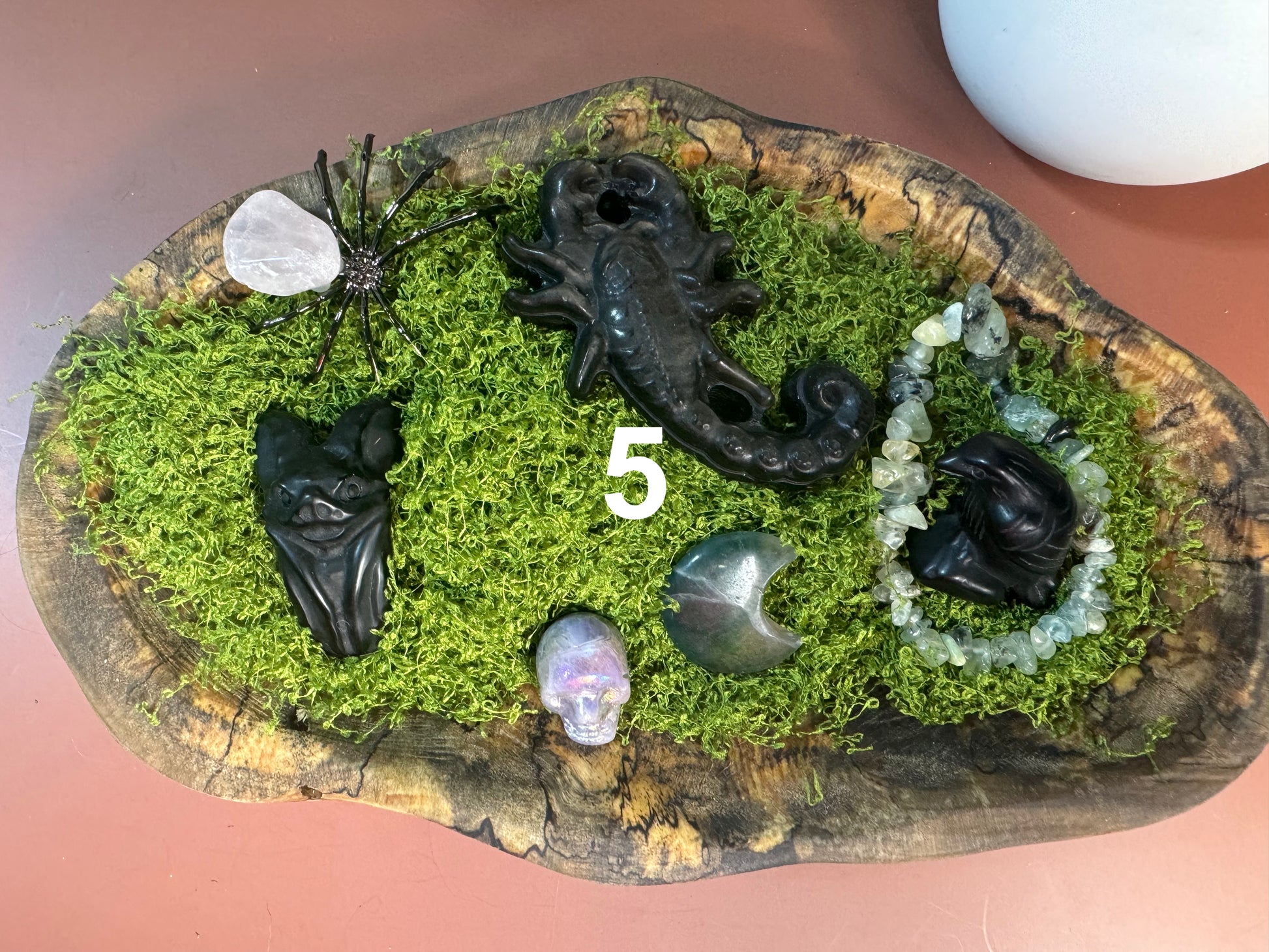 Step into the mystical and macabre with the Phantom Curiosities. Curated for Halloween enthusiasts, collectors, and lovers of all things eerie, this box combines miniature carvings and crystals to create a compact, enchanting experience.